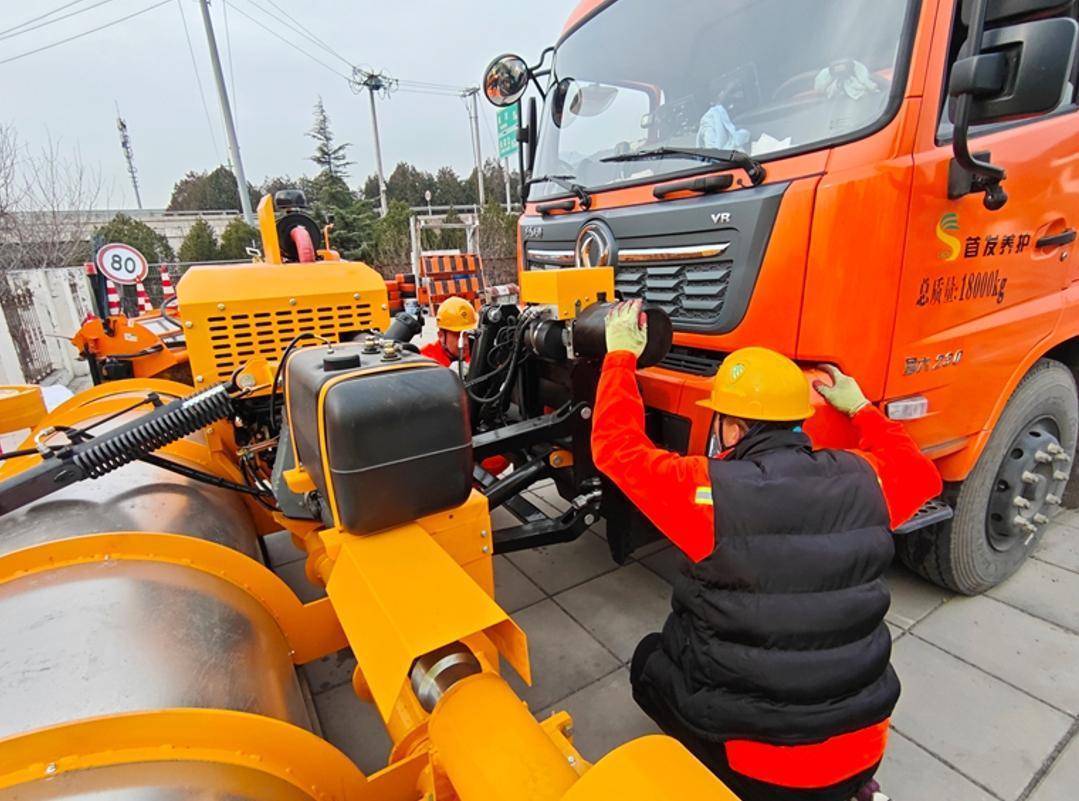 为应对此次降雪,首发养护秉持“绿色除雪、精准撒布”理念,完成各类应急物资足额储备与设备优化配置。设备保障方面,600余台套除雪设备已全部完成检修调试。同时所有核心设备均安装“可视可话设备”,实现扫雪铲冰过程的实时视频回传、语音对讲及指挥调度全覆盖,全面掌握作业动态。