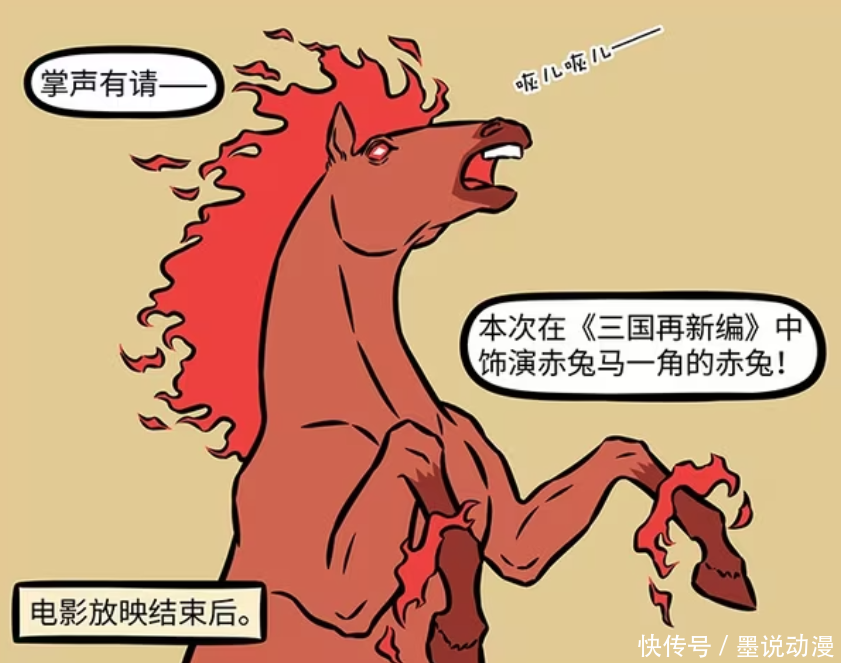 赤兔在观影会现场出现,还是那么有辨识度。不过这时候的赤兔,其实已经死亡,设定是幽灵马,平时会变成原本的模样。赤兔在《三国再新编》中饰演赤兔马,也就是我演我自己。此时关羽并没有出现,但这并不影响赤兔的人气。